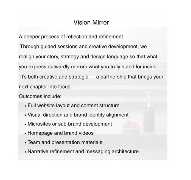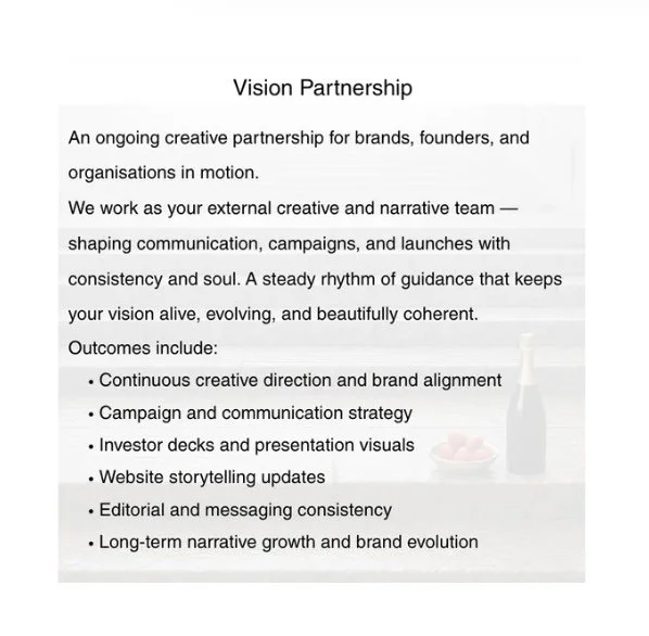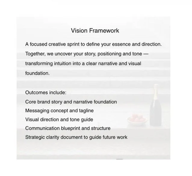 Vision Framework, Vision Mirror and Vision Partnership will guide you from insight to expression, transforming ideas into narratives that people can feel, remember and believe in.